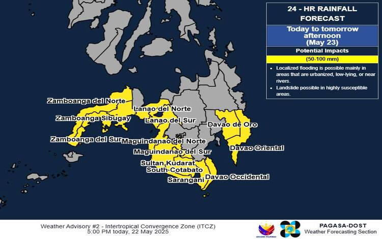 The Philippine Atmospheric, Geophysical and Astronomical Services Administration (PAGASA) issued its 5:00 PM weather bulletin today, May 22, 2025, highlighting the continued influence of the Intertropical Convergence Zone (ITCZ) over Mindanao. Meanwhile, the ridge of a High Pressure Area (HPA) is extending its effect over extreme northern Luzon, and the easterlies continue to affect the rest of the country.