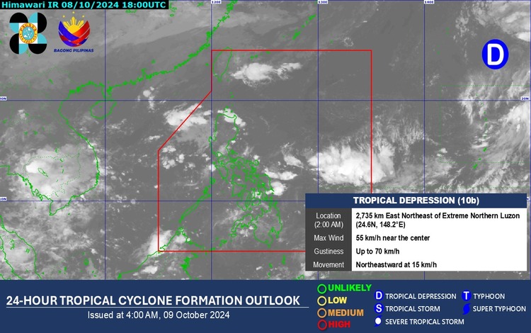 As of 3:00 AM today, a Tropical Depression is located 2,755 km east-northeast of extreme Northern Luzon, outside the Philippine Area of Responsibility (PAR). The depression is currently at coordinates 24.8°N, 148.4°E, with maximum sustained winds of 55 km/h near the center and gustiness reaching up to 70 km/h. It is moving northeastward at a speed of 15 km/h. Despite its proximity, Pagasa reports that this tropical depression remains unlikely to enter the PAR.