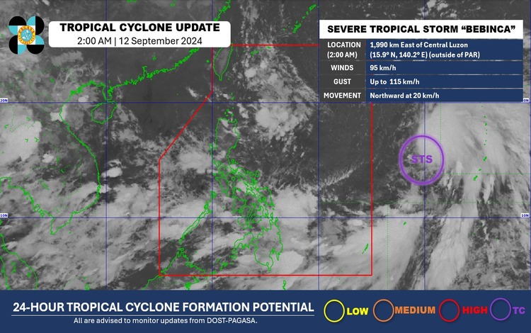 As of 3:00 AM today, the trough of Severe Tropical Storm (STS) Bebinca continues to affect the eastern sections of Luzon and Visayas. Meanwhile, the Southwest Monsoon influences weather patterns in Mindanao, Southern Luzon, and Visayas. Severe Tropical Storm Bebinca, located 1,975 km east of Central Luzon (16.2°N, 140.1°E), carries maximum sustained winds of 95 km/h and gusts up to 115 km/h, moving northward at 20 km/h. While outside the Philippine Area of Responsibility (PAR), its effects are already felt in the region.