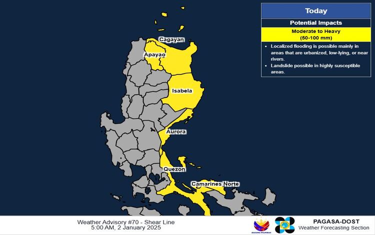 The Philippine Atmospheric, Geophysical, and Astronomical Services Administration (PAGASA) has issued its weather forecast for January 2, 2025, highlighting the effects of the Intertropical Convergence Zone (ITCZ), the Shear Line, and the Northeast Monsoon across various parts of the country.