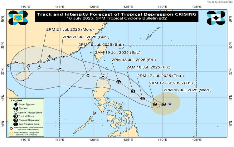 MANILA, Philippines — July 16, 2025. Tropical Depression Crising continues its west-southwestward track over the Philippine Sea, edging closer to Catanduanes, according to the Philippine Atmospheric, Geophysical and Astronomical Services Administration (PAGASA).