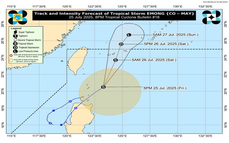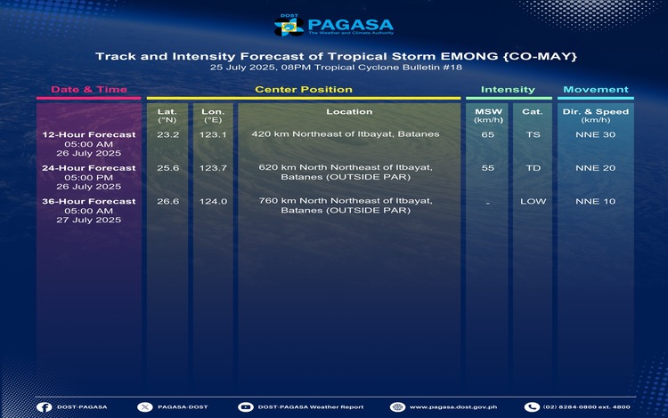 Tropical Storm Emong (international name: Co-may) is now moving away from Batanes, according to the Philippine Atmospheric, Geophysical and Astronomical Services Administration (PAGASA). As of 7:00 PM, the center of Emong was located 195 km east of Itbayat, Batanes, with maximum sustained winds of 85 km/h, gusts reaching up to 105 km/h, and a central pressure of 992 hPa. The storm is moving northeastward at a speed of 40 km/h.